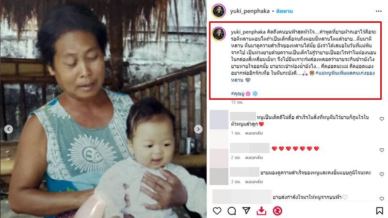 ท่ามกลางแฟนคลับที่เข้ามากดส่งหัวใจรัวๆ พร้อมคอมเมนต์ให้กำลังใจ สาวยูกิ มากมาย อาทิ หนูเป็นเด็กดีไม่ดื้อ สำเร็จในสิ่งที่หนูฝันไว้ ยายก็ภูมิใจในตัวหนูแล้วลูก, ยายมองดูความสำเร็จของหนูและคงยิ้มแบบภูมิใจนะคะ, ยายส่งกำลังใจมาให้หนูจากบนฟ้า ฯลฯ
