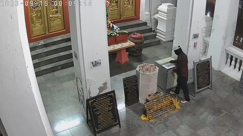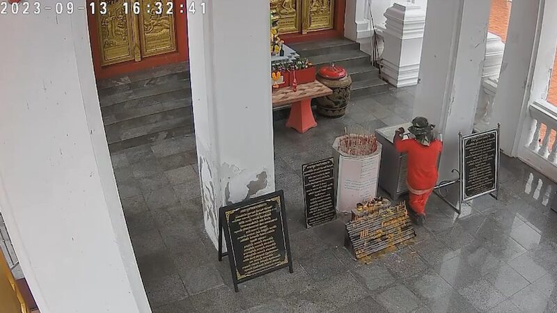 ครั้งแรกที่กล้องบันทึกไว้ได้ก็เป็นเวลา 16.32 น.วันที่ 13 ก.ย.2566 คนร้ายเป็นชาย อายุประมาณ 40-50 ปี รูปร่างท้วม ผิวดำ ผมยาว สวมชุดสีแดง สวมหมวกปิดบังใบหน้า เดินขึ้นมาหน้าโบสถ์ ก่อนใช้ตลับเมตรติดปลายด้วยกาว หรือหมากฝรั่ง แหย่ลงไปในตู้บริจาค และดึงแบงก์ขึ้นมา