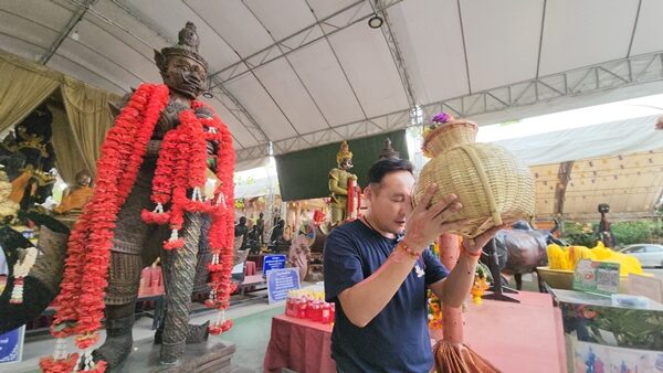 อาจารย์สรณ์ กล่าวต่อว่า ก่อนเดินทางกลับไม่ลืมที่จะกราบไหว้ขอพร ขอโชคลาภจากท้าวเวสสุวรรณ ที่นับถือ โดยนำเครื่องเซ่นไหว้และพวงมาลัยสีแดง จุดธูปก่อนที่จะนำพวงมาลัยไปคล้องที่กระบองท้าวเวสสุวรรณ แล้วนำศีรษะจรดที่หน้าผากพร้อมคำอธิษฐาน