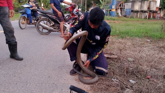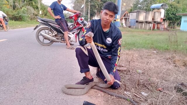 วันที่ 16 ธ.ค.2567 นายศรัณญ์ อายุ 65 ปี บ้านเลขที่ 23/1 ม.8 ต.สะท้อน อ.นาทวี จ.สงขลา พบงูจงอางกินงูเห่าอยู่หน้าบ้าน ขอให้ทีมอสรพิษฯ ช่วยมาจับงูจงอางให้ นายทวีศักดิ์ บุญเศษ เจ้าหน้าที่ทีมอสรพิษวิทยา ภาคใต้ อ.นาทวี ได้รับแจ้ง จึงรุดไปตรวจสอบยังหน้าบ้านเลขที่ดังกล่าวทันที