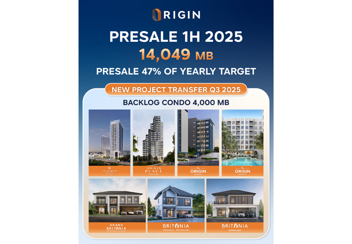 ออริจิ้น พร็อพเพอร์ตี้ โชว์ยอดขาย 6 เดือนพุ่งทะลุกว่า 14,000 ล้านบาท ดัน Backlog เพิ่มขึ้น จับตาครึ่งปีหลังพร้อมลุยต่อตามกลยุทธ์ Resilience Leads To Sustainable Growth