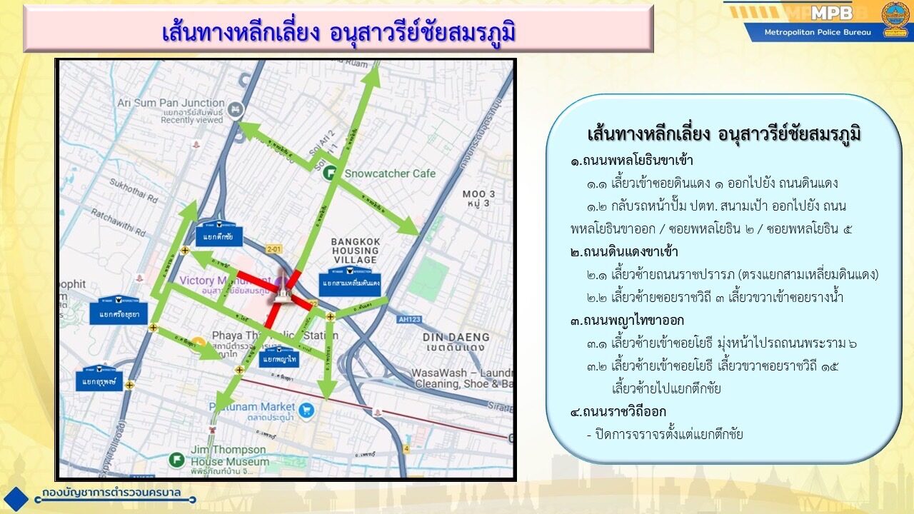 บช.น. แจ้งประชาสัมพันธ์เส้นทางหลีกเลี่ยง พื้นที่การชุมนุม บริเวณอนุสาวรีย์ชัยสมรภูมิ ในวันที่ 28 มิ.ย.2568