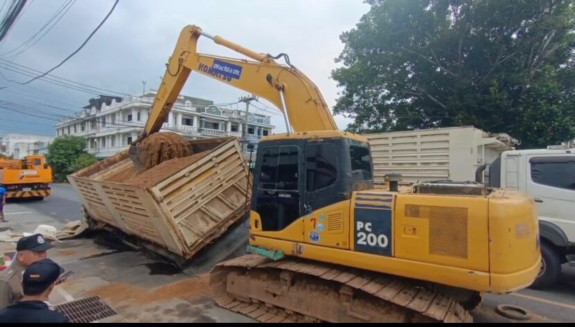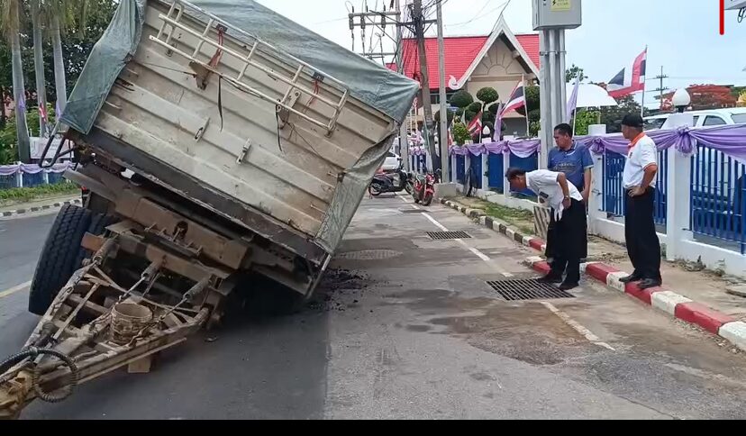 เมื่อเวลา 14.00 น. วันที่ 5 มิ.ย.2568 พ.ต.ท.ยันต์ยงค์ นามโคตร รองผกก.(สอบสวน) สภ.เมืองยโสธร รับแจ้งเหตุ รถพ่วง 22 ล้อ บรรทุกทรายเต็มค้น ตกหลุมถนนลาดยางมะตอย โครงการก่อสร้างระบบป้องกันน้ำท่วมพื้นที่ชุมชนเมืองยโสธร ระยะที่ 1 อ.เมือง จ.ยโสธร จึงเดินทางไปตรวจสอบ