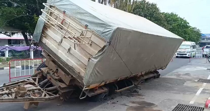 ที่เกิดเหตุเป็นถนน 2 เลน พบรถบรรทุกพ่วง 22 ล้อบรรทุกทรายเต็มคันทั้ง 2 พ่วง ส่วนลูกพ่วง 12 ล้อ ถนนทรุดยาวประมาณ 3 เมตร ทำให้ล้อตกลงไปไม่สามารถขึ้นได้ ต่อมาพบว่าลูกจ้างของรถบรรทุกพ่วงได้มาถอดสายต่อพ่วงแล้วขับตัวแม่ออกจากพื้นที่เกิดเหตุ