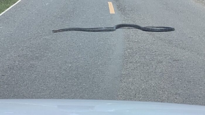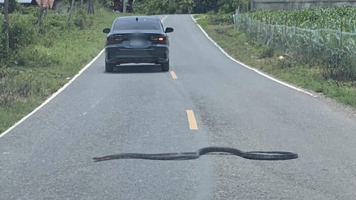 เพราะจู่ ๆ มีงูจงอางดำทะมึนขนาดใหญ่ยาวกว่า 3 เมตร ชูคอแผ่แม่เบี้ยอยู่ข้างทางแล้วเลื้อยตัดหน้ารถกลางถนน ทำให้รถเบรกแทบหน้าทิ่มจากการตกใจและกลัว หลังจากนั้นงูก็เลื้อยลงป่าข้างทาง ซึ่งงูชนิดนี้ไม่เคยพบเห็นในพื้นที่ จ.พะเยา มาก่อน เห็นแต่ทางภาคใต้เท่านั้น