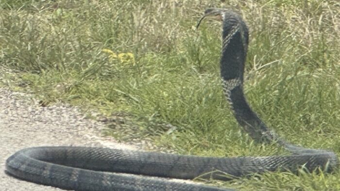 เบรกหัวทิ่ม สาวขับรถอยู่แทบช็อก งูจงอาง ตัวเขื่องเลื้อยตัดหน้า ชูคอแผ่แม่เบี้ย เผย ไม่เคยเห็นตัวใหญ่ขาดนี้มาก่อน ฝากเตือนชาวบ้านในพื้นที่ให้ระวัง