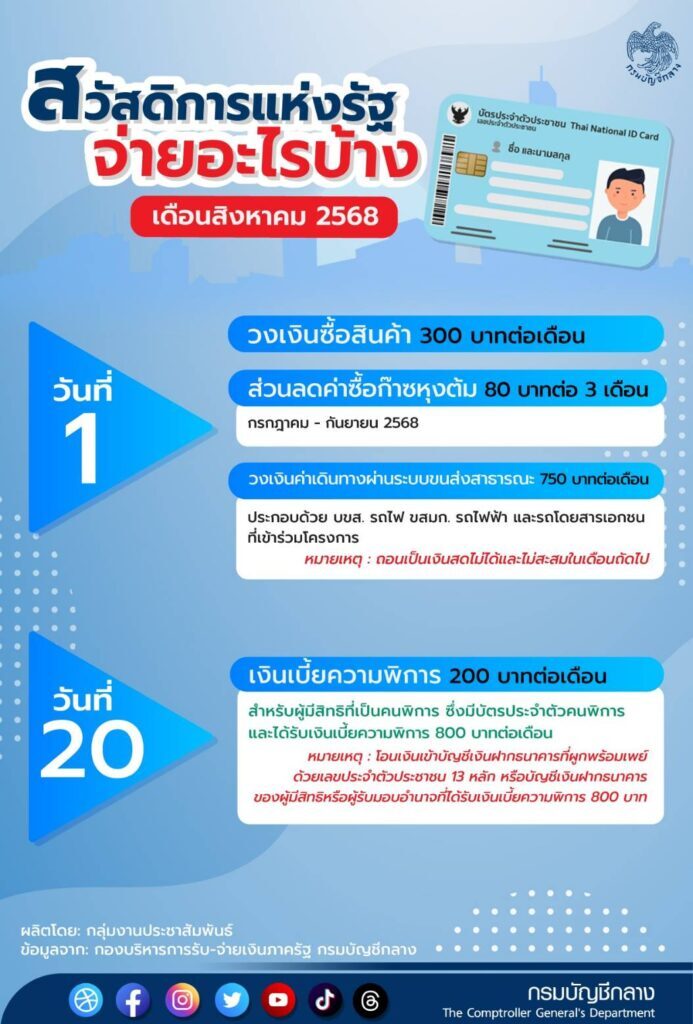 วันที่ 5 ส.ค.2568 น.ส.ทิวาพร ผาสุข รองอธิบดีกรมบัญชีกลาง ในฐานะโฆษกกรมบัญชีกลาง กล่าวว่า โครงการลงทะเบียนเพื่อสวัสดิการแห่งรัฐ ปี 2565 ผู้มีสิทธิสามารถใช้สิทธิผ่านบัตรประจำตัวประชาชนแบบสมาร์ทการ์ด ซึ่งในเดือน ส.ค.2568 จะได้รับสิทธิ ดังนี้