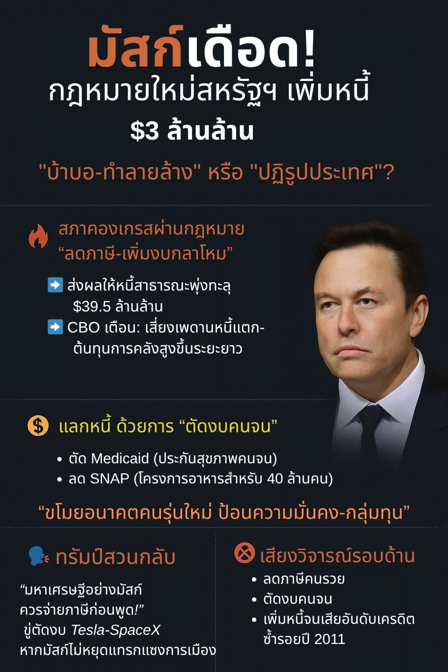 #อีลอนมัสก์ #ทรัมป์ #กฎหมายลดภาษี #งบกลาโหมสหรัฐ #สภาคองเกรส #หนี้สาธารณะสหรัฐ #วิเคราะห์การเมืองโลก #ข่าวต่างประเทศ #เศรษฐกิจสหรัฐ