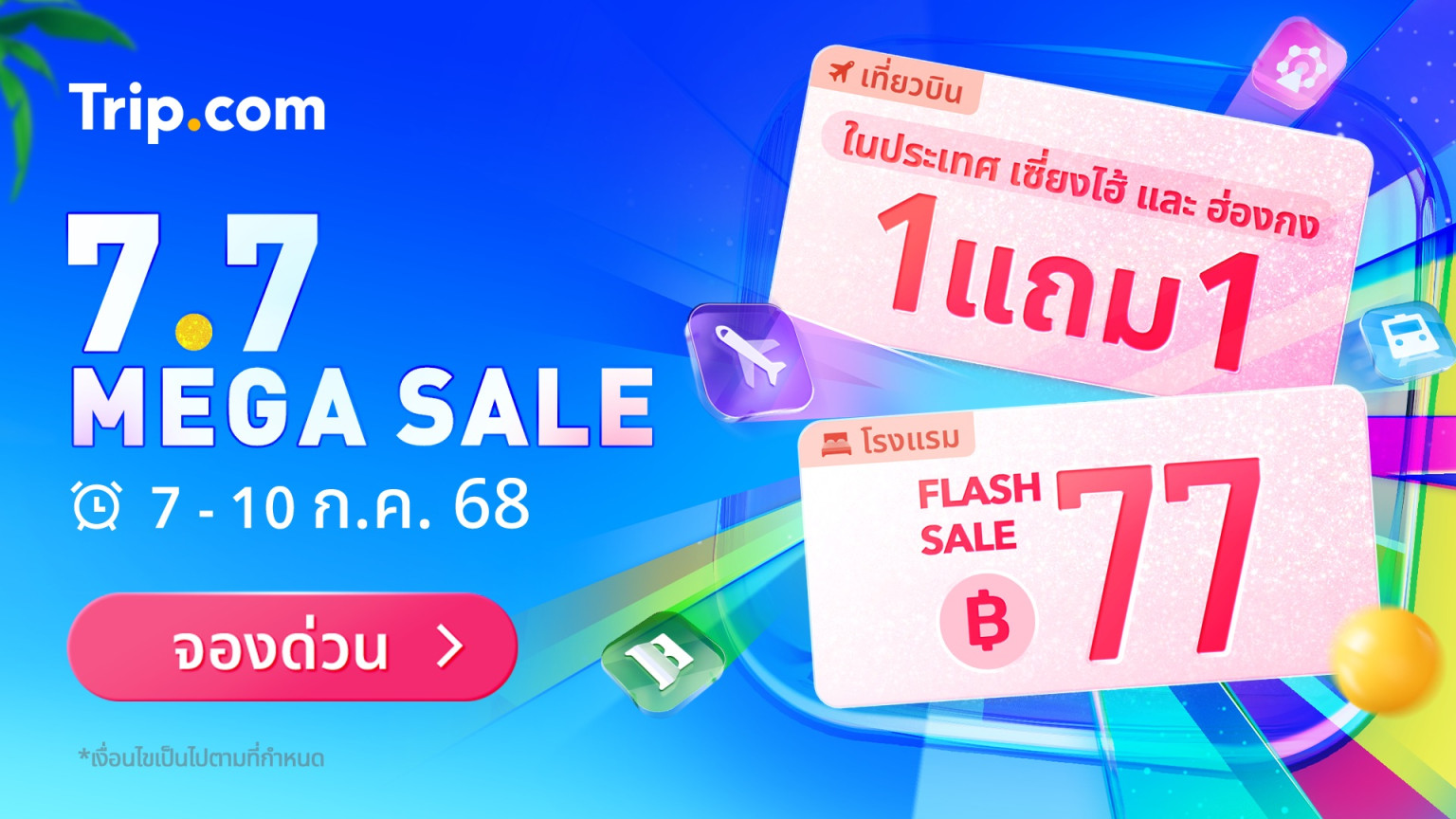 วันที่ 4 กรกฎาคม 2568 ผู้สื่อข่าวรายงาน ว่า Trip.com ผู้ให้บริการด้านการท่องเที่ยวชั้นนำจัดแคมเปญ 7.7 Mega Sale ที่รวมดีลสุดคุ้มสำหรับการท่องเที่ยวสำหรับการจองโรงแรม เที่ยวบิน และสถานที่ท่องเที่ยวให้กับนักเดินทาง โปรโมชันนี้จะจัดขึ้นตั้งแต่วันที่ 7 – 10 กรกฎาคม 2568 โดยไฮไลท์เด็ดคือโรงแรมราคาเพียง 77 บาท* ตั๋วเครื่องบินซื้อ 1 แถม 1* รวมถึงตั๋วเข้าสถานที่ท่องเที่ยวชั้นนำพร้อมดีลเช่ารถราคาพิเศษทั่วโลก