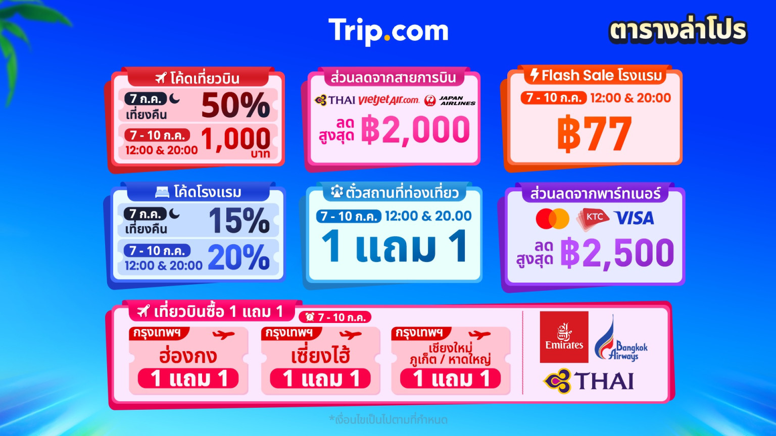 Trip.com จัดโปรฯ 7.7 ดีลท่องเที่ยวเด็ดครบครันโรงแรม 77 บาท ตั๋วบินซื้อ 1 แถม 1