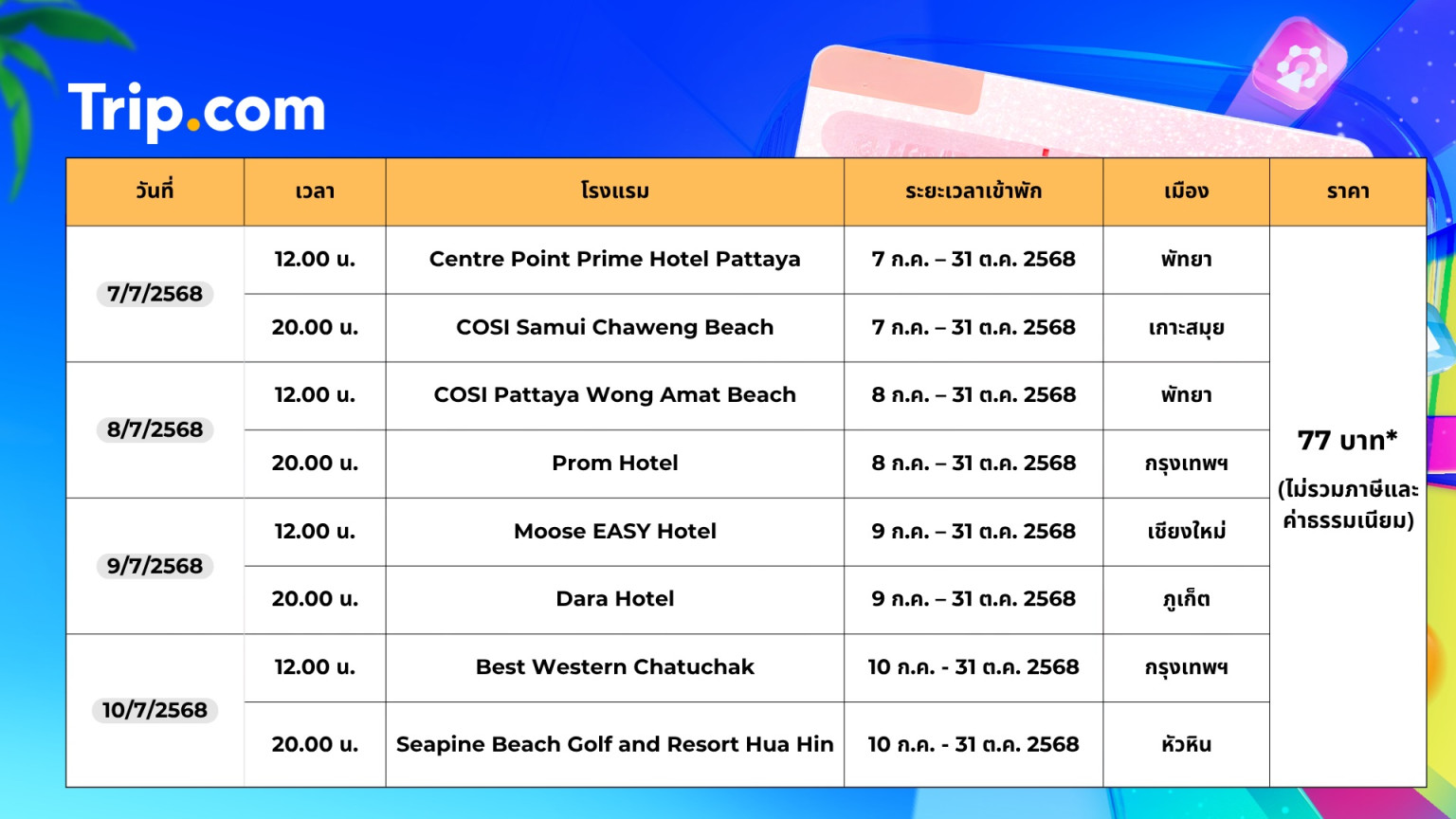 สำหรับ ไฮไลท์พิเศษใน 7.7 Mega Sale ปีนี้มาพร้อมดีลท่องเที่ยวสุดพิเศษที่คัดสรรมาอย่างดี สำหรับการจองโรงแรม ทาง Trip.com มี 8 โรงแรมที่คัดมาเป็นพิเศษราคาเพียงคืนละ 77 บาท* ในช่วง Flash Sales เวลา 12.00 น. และ 20.00 น. ทุกวันตลอดระยะเวลาโปรโมชั่น