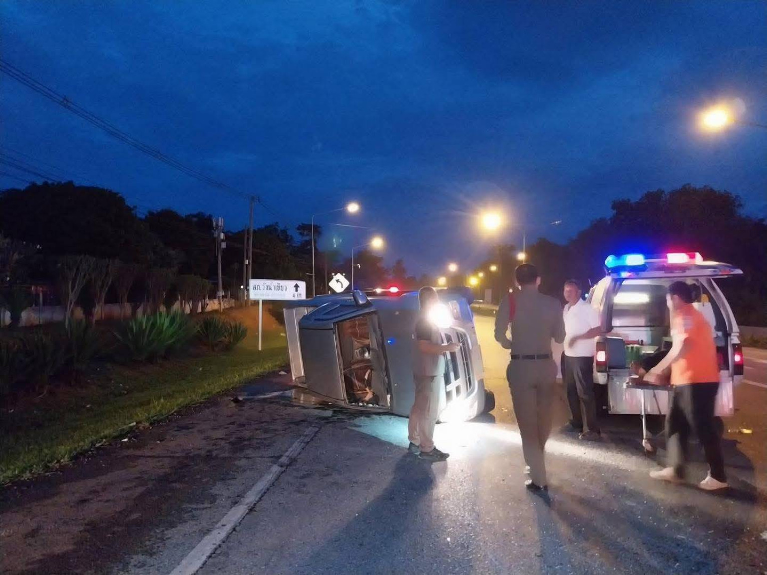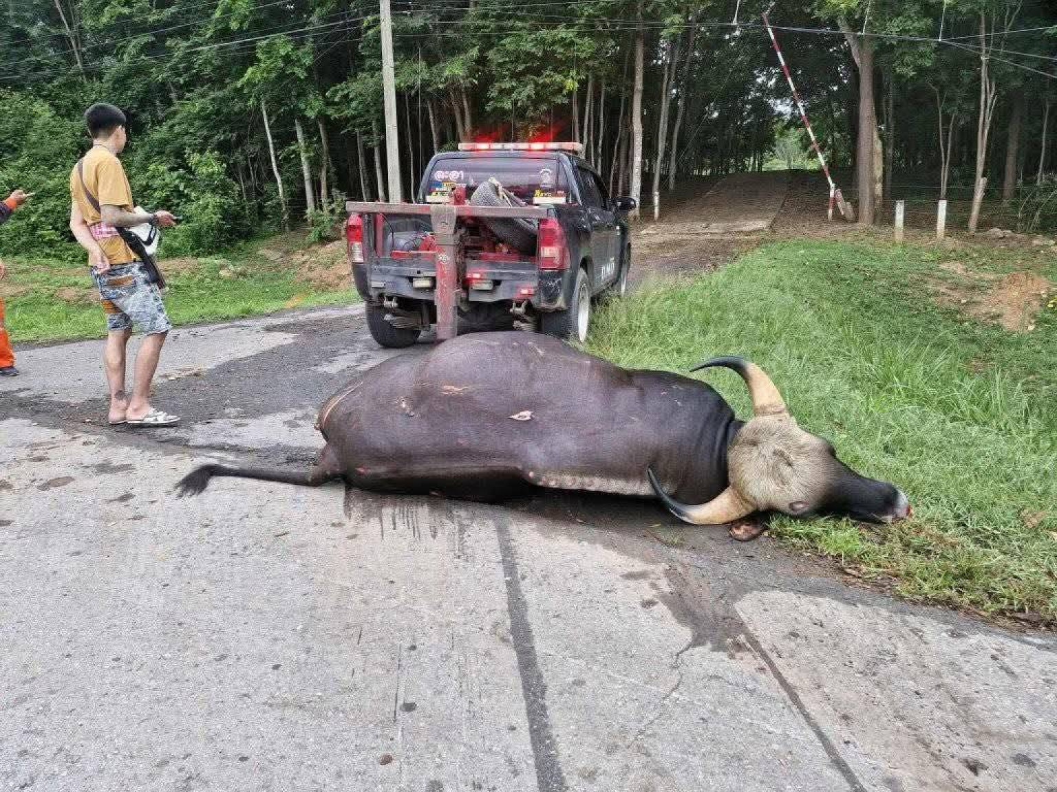 โคราช กระทิงวิ่งออกจากผืนป่าทับลาน ตัดหน้ารถบรรทุกพุ่งชนตาย รถกระบะแล่นตามหลังชนซ้ำพลิกคว่ำเจ็บ 7 ราย