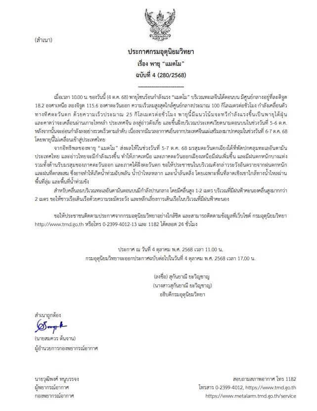 วันที่ 4 ต.ค.2568 กรมอุตุนิยมวิทยา ประกาศ เรื่อง พายุ "แมตโม" ฉบับที่ 4 (280/2568) ระบุว่า เมื่อเวลา 10.00 น. ของวันนี้ (4 ต.ค. 68) พายุโซนร้อนกำลังแรง "แมตโม" บริเวณทะเลจีนใต้ตอนบน มีศูนย์กลางอยู่ที่ละติจูด 18.2 องศาเหนือ ลองจิจูด 115.6 องศาตะวันออก ความเร็วลมสูงสุดใกล้ศูนย์กลางประมาณ 100 กิโลเมตรต่อชั่วโมง กำลังเคลื่อนตัวทางทิศตะวันตก ด้วยความเร็วประมาณ 25 กิโลเมตรต่อชั่วโมง