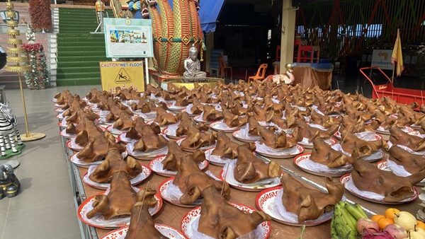 โดยนำใส่ถาดวางเรียงรายเต็มลานกว้างด้านหน้าองค์หลวงพ่อสมหวัง ทั้งนี้ ครอบครัวของนายวัฒน์ ได้ทำการจุดธูปกราบไหว้บูชาเทพเทวดาสิ่งศักดิ์สิทธิ์ให้การแก้บนเป็นสำเร็จเสร็จสิ้น