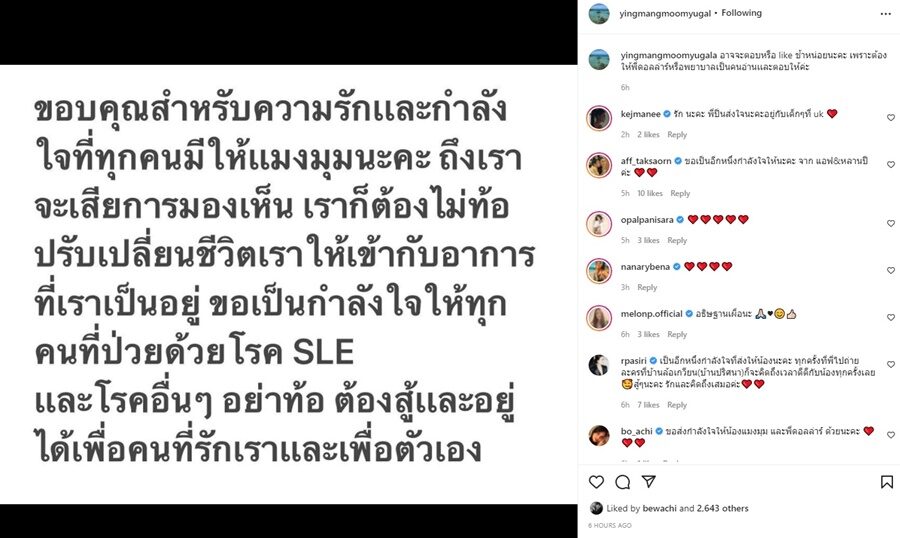 ล่าสุด คุณหญิงแมงมุม โพสต์ภาพข้อความขอบคุณสำหรับความรักและกำลังใจที่ทุกคนมีให้แมงมุมนะคะ ถึงเราจะเสียการมองเห็น เราก็ต้องไม่ท้อปรับเปลี่ยนชีวิตเรา ให้เข้ากับอาการที่เราเป็นอยู่ ขอเป็นกำลังใจให้ทุกคนที่ป่วยด้วยโรค SLE และโรคอื่นๆ อย่าท้อ ต้องสู้และอยู่ได้เพื่อคนที่รักเราและเพื่อตัวเอง