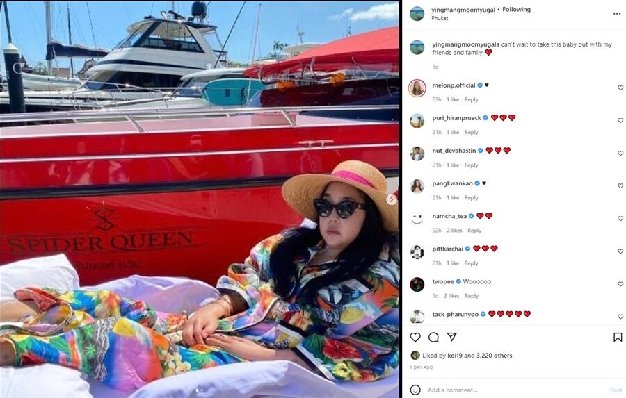 ทั้งนี้มีเสธ.ดอลล่าร์สามีคอยดูแลอยู่เคียงข้าง นอกจากนั้นอินสตาแกรมของคุณหญิงแมงมุมยังได้โพสต์ภาพขณะอยู่บนเรือ พร้อมแคปชั่นว่า can’t wait to take this baby out with my friends and family ขณะที่มีคนเข้ามาส่งกำลังใจให้จำนวนมาก