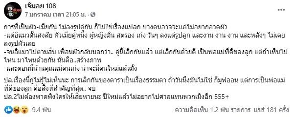 กรณีเพจเจ๊มอย 108 เผยกระแสข่าวเม้าธ์แรง ถึงสามีภรรยาคู่หนึ่งที่ช่วงหลังๆ ไม่ได้ลงรูปคู่กันเลย ผู้หญิงมั่นสตรองเก่ง วันๆลงแต่รูปลูกและงานเท่านั้น โดยคนใกล้ตัวก็บอกว่าคู่นี้เลิกกันแล้ว แต่เลิกกันด้วยดี เป็นพ่อแม่ที่ดีของลูก ที่เห็นไปไหนมาไหนด้วยกันเป็นการสร้างภาพ