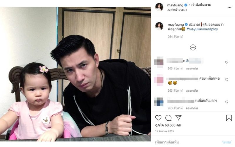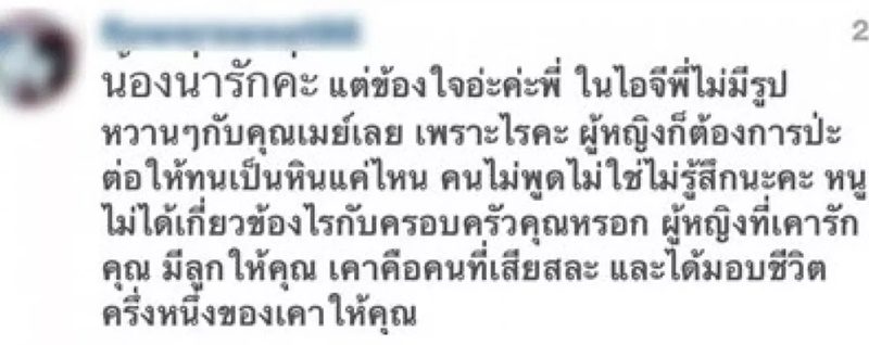 “ก่อนอื่นขอบคุณนะครับที่ชมลูกสาวผม และคิดอยู่นานมาก ว่าจะชี้แจงสิ่งที่คุณคอมเม้นมาในไอจีผมดีหรือไม่ แต่บอกเลยครับว่าผมอึดอัดกับคอมเม้นคุณมาก เพราะสิ่งที่คุณคิด มันเป็นการคิดแทนและตัดสินผมไปแล้ว ถ้าจะบอกว่าผมไม่เคยลงรูปหวานๆกับคุณเมย์เลย กรุณาเลื่อนลงไปดูก่อนพิมพ์หรือพูดอะไรพล่อยๆตามความคิดตัวเองดีกว่านะครับ