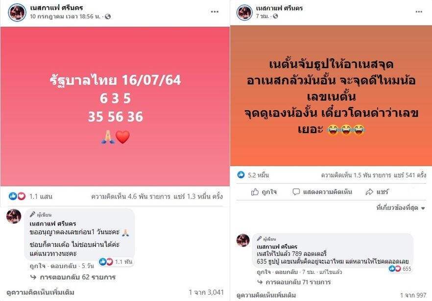 โดยสาวเนส โพสต์บอกตรงๆ เลขเด็ด พร้อมเผยด้วยว่า ขออนุญาตลงเลขก่อน1 วันนะคะ ชอบก็ตามเด้อ ไม่ชอบผ่านได้ค่ะ แค่แนวทางนะคะ โดยนักร้องสาวระบุข้อความ รัฐบาลไทย 16-07/64 พร้อมเผยเลข 3 ตัว 6 3 5 และ 2 ตัว 35 , 56 , 36