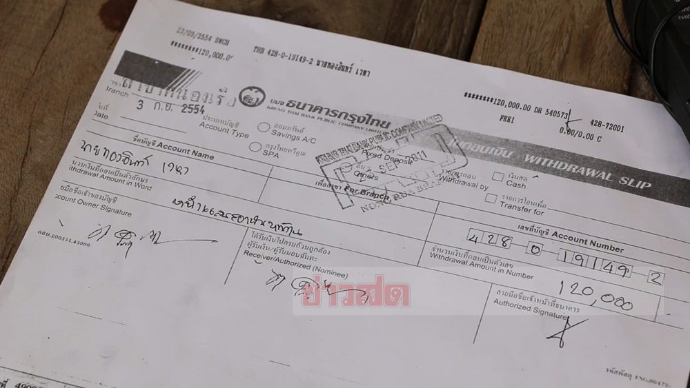 โดยการเขียนใบถอนเงินจากธนาคาร ลงวันที่ 3 ก.ย.2554 แต่ประทับตราอนุมัติจ่ายเงินวันที่ 23 ก.ย.2554 ซึ่งยังมีข้อพิรุธอีกหลายจุด ทั้งจำนวนตัวเลขที่เขียนเป็นตัวเลขอารบิก 120,000 บาท แต่เขียนเป็นตัวหนังสือภาษาไทยว่า หนึ่งแสนสองพันบาทถ้วน และลายเซ็นที่เซ็นก็ไม่ใช่ลายเซ็นของตัวเอง