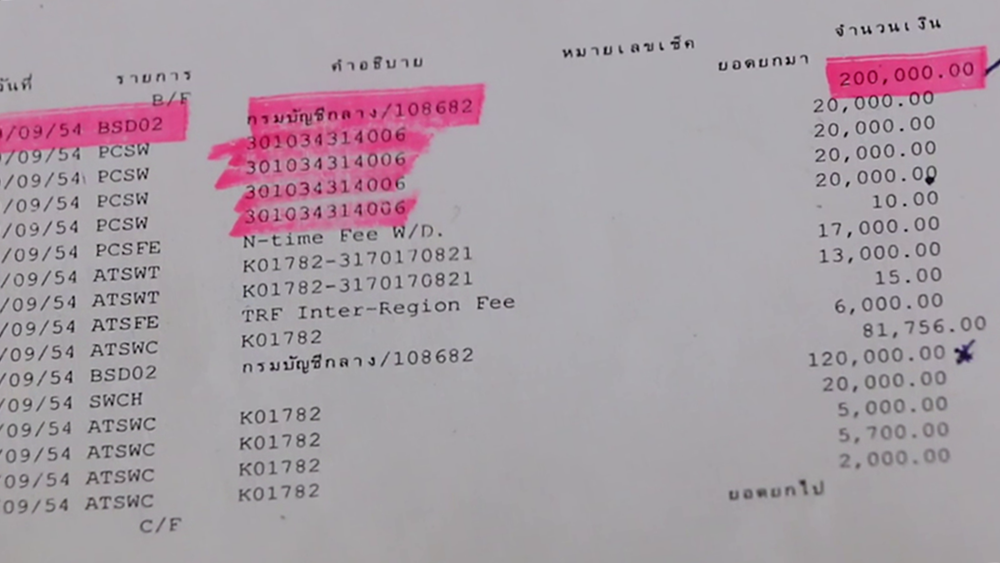 ซึ่งเจ้าหน้าที่แจ้งว่า เงินบำเหน็จตกทอดจำนวน 200,000 บาท นั้นกรมบัญชีกลางโอนเข้าบัญชีเรียบร้อยแล้ว ตั้งแต่วันที่ 9 ก.ย.2554 และเจ้าหน้าที่รายดังกล่าวยังเปิดให้ดูรายละเอียดการรับโอนเงินเข้าบัญชีจากกรมบัญชีกลาง จึงทำให้รู้ว่ามีเงินบำเหน็จตกทอดจำนวน 200,000 บาท เข้าบัญชีตัวเองจริง แต่พบว่าตัวเองไม่ได้เงินแม้แต่บาทเดียว เจ้าหน้าที่จึงให้ไปขอรายละเอียดการเดินบัญชี และตรวจสอบที่ธนาคารกรุงไทยสาขา อ.หนองเรือ เพื่อจะได้ทราบข้อเท็จจริงของเงินที่โอนเข้าบัญชีถึงเส้นทางการเงิน