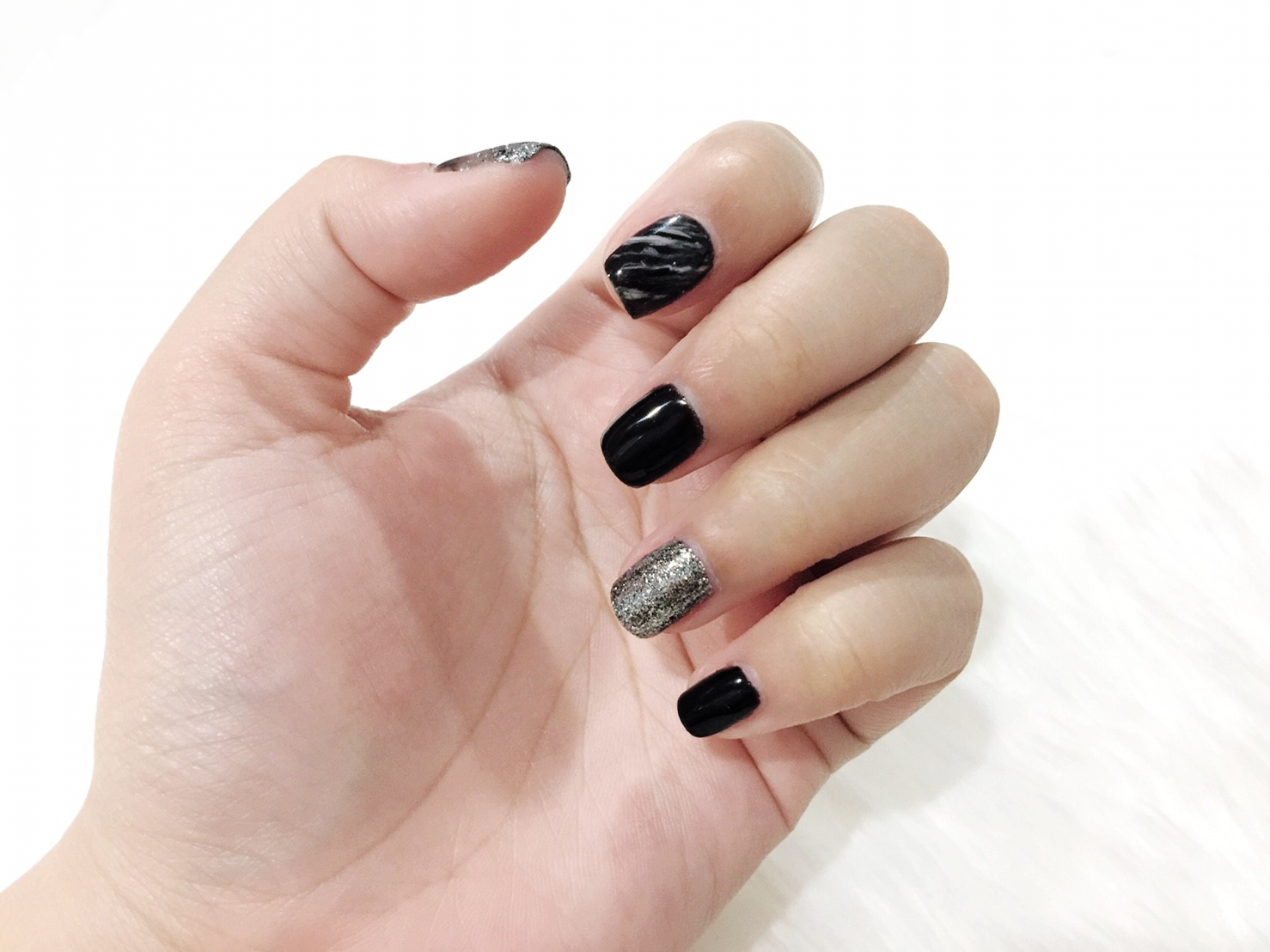 จะเป็นสีดำเรียบ + กลิตเตอร์สีเงิน + ลายหินอ่อน + ไล่ระดับกลิตเกอร์