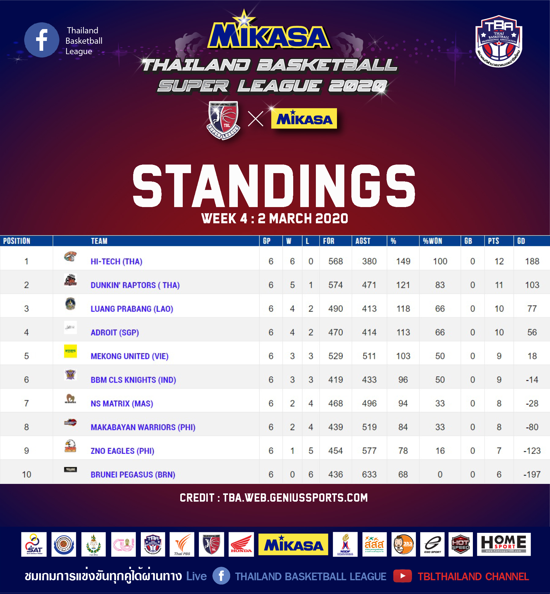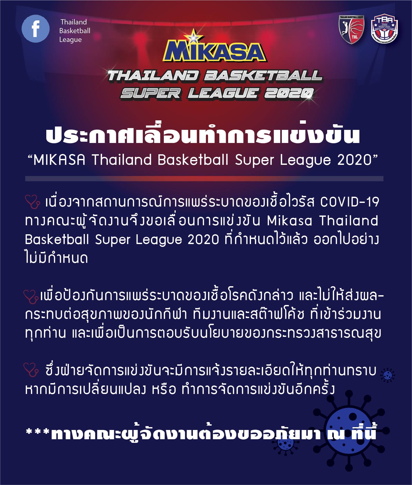 ขอแจ้งให้มีการเลื่อนการแข่งขันบาสเกตบอล ไทยแลนด์ ซุปเปอร์ ลีค 2020 หรือ TBSL2020 ออกไปก่อน จนกว่าสถานการณ์จะดีขึ้นแล้ว