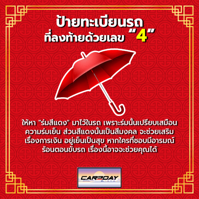 ใครที่มีเลขท้ายของทะเบียนรถหมายเลข 4 ให้หา "ร่มสีแดง" มาไว้ในรถ เพราะร่มนั้นเปรียบเสมือนความร่มเย็น ส่วนสีแดงนั้นเป็นสีมงคล จะช่วยเสริมเรื่องการเงิน อยู่เย็นเป็นสุข หากใครที่ชอบมีอารมณ์ร้อนตอนขับรถ เรื่องนี้อาจจะช่วยคุณได้