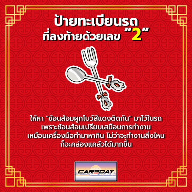ใครที่มีเลขท้ายของทะเบียนรถหมายเลข 2 ให้หา "ช้อนส้อมผูกโบว์สีแดงติดกัน" มาไว้ในรถ เพราะช้อนส้อมเปรียบเสมือนการทำงาน เหมือนเครื่องมือทำมาหากิน ไม่ว่าจะทำงานสิ่งไหนก็จะคล่องแคล้วได้มากขึ้น