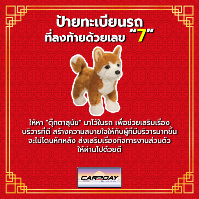 ใครที่มีเลขท้ายของทะเบียนรถหมายเลข 7 ให้หา "ตุ๊กตาสุนัข" มาไว้ในรถ เพื่อช่วยเสริมเรื่องบริวารที่ดี สร้างความสบายใจให้กับผู้ที่มีบริวารมากขึ้น จะไม่โดนหักหลัง ส่งเสริมเรื่องกิจการงานส่วนตัวให้ผ่านไปด้วยดี