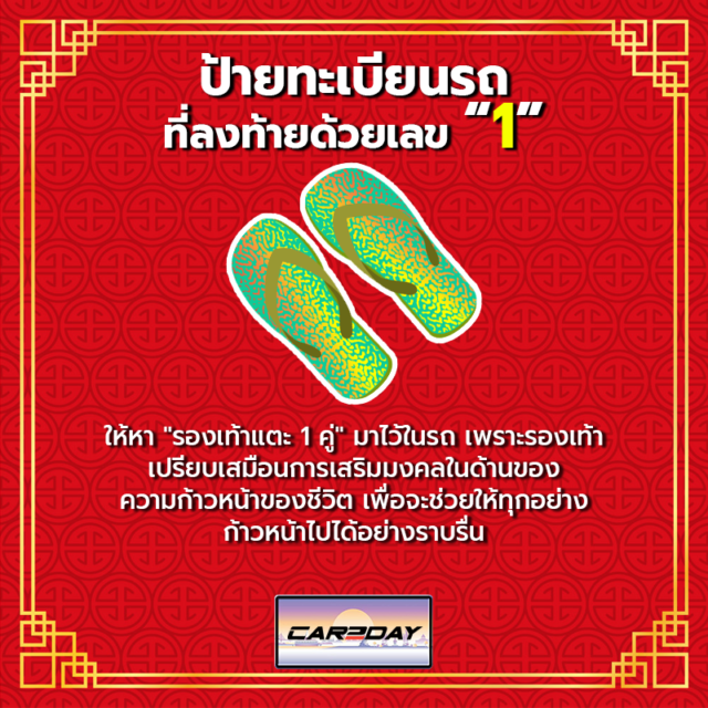 ใครที่มีเลขท้ายของทะเบียนรถหมายเลข 1 ให้หา "รองเท้าแตะ 1 คู่" มาไว้ในรถ เพราะรองเท้าเปรียบเสมือนการเสริมมงคลในด้านของความก้าวหน้าของชีวิต เพื่อจะช่วยให้ทุกอย่างก้าวหน้าไปได้อย่างราบรื่น