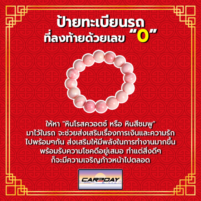 ใครที่มีเลขท้ายของทะเบียนรถหมายเลข 0 ให้หา "หินโรสควอตซ์ หรือ หินสีชมพู" มาไว้ในรถ จะช่วยส่งเสริมเรื่องการเงินและความรักไปพร้อมๆกัน ส่งเสริมให้มีพลังในการทำงานมากขึ้น พร้อมรับความโชคดีอยู่เสมอ ทำแต่สิ่งดีๆ ก็จะเจริญก้าวหน้าไปตลอด