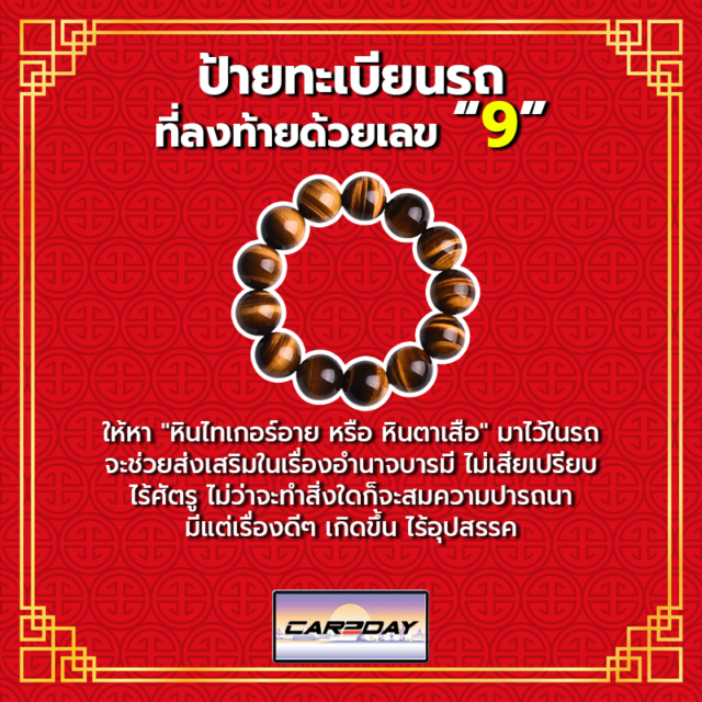 ใครที่มีเลขท้ายของทะเบียนรถหมายเลข 9 ให้หา "หินไทเกอร์อาย หรือ หินตาเสือ" มาไว้ในรถ จะช่วยส่งเสริมในเรื่องอำนาจบารมี ไม่เสียเปรียบ ไร้ศัตรู ไม่ว่าจะทำสิ่งใดก็จะสมความปารถนา มีแต่เรื่องดีๆ เกิดขึ้น ไร้อุปสรรค