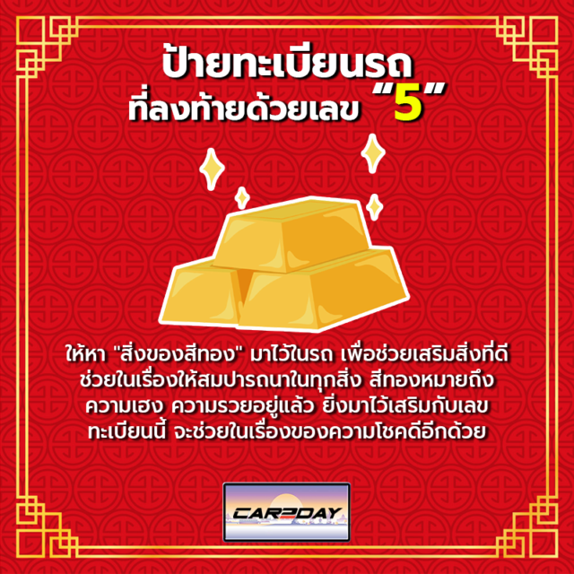 ใครที่มีเลขท้ายของทะเบียนรถหมายเลข 5 ให้หา "สิ่งของสีทอง" มาไว้ในรถ เพื่อช่วยเสริมสิ่งที่ดี ช่วยในเรื่องให้สมปารถนาในทุกสิ่ง สีทองหมายถึงความเฮง ความรวยอยู่แล้ว ยิ่งมาไว้เสริมกับเลขทะเบียนนี้ จะช่วยในเรื่องความโชคดีอีกด้วย