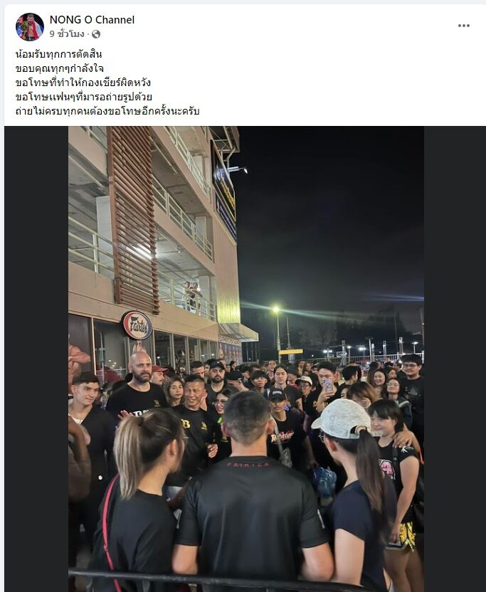 น้องโอ๋ ได้โพสต์ข้อความผ่านทางเฟซบุ๊กNONG O Channel ระบุว่า น้อมรับทุกการตัดสิน ขอบคุณทุกๆกำลังใจ ขอโทษที่ทำให้กองเชียร์ผิดหวัง ขอโทษเเฟนๆที่มารอถ่ายรูปด้วย ถ่ายไม่ครบทุกคนต้องขอโทษอีกครั้งนะครับ