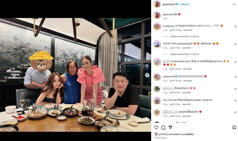 แต่ที่ทำเอาคอมเมนต์กันรัวๆ แห่โฟกัสกับหนุ่มข้างกาย เป้ย ซึ่งมีหัวพี่หมีมาปิดหน้าไว้ด้วย แฟนๆ แห่ถามกันรัวๆ อาทิ ทำไมต้องใส่หัวตุ๊กตาาาน้าาาาาาาา…… ????? , สวยทุกคนเลย แต่!!! พี่หมี เราโฟกัสพี่หมีรูปแรกกกกก , พี่ครีมคือใบ้ตลอดเวลา55555555555 , ใครน้าาาา แม่ , ใครหัวหมีอะแม่ เป็นต้น