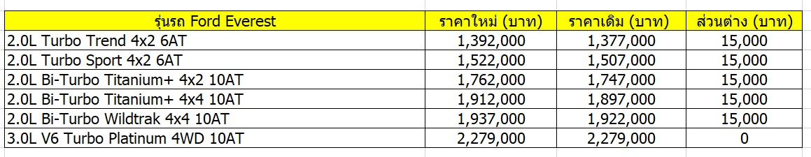 ทางด้านอเนกประสงค์หรูอย่าง Ford Everest จำหน่ายทั้งหมด 4 รุ่นย่อย ราคาเดิมเริ่มต้นจากเดิม 1,377,000-2,279,000 บาท ปรับราคาใหม่เป็น 1,392,000-2,279,000 บาท โดยมีราคาจำหน่ายดังนี้
