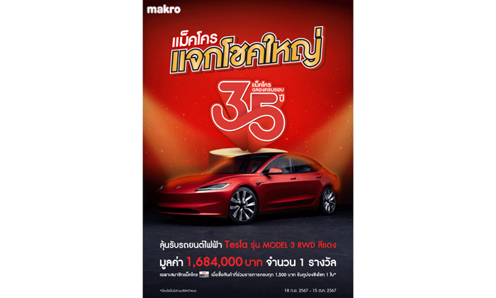 ในโอกาสครบรอบ 35 ปี แม็คโครได้เตรียมเซอร์ไพรส์พิเศษ ร่วมกับทางพรีเซนเตอร์ ญาญ่า อุรัสยา ที่เตรียมส่งมอบความสุขให้ลูกค้าคนสำคัญ รวมถึงส่งแคมเปญแจกโชคใหญ่ที่ตอบโจทย์ และรู้ใจผู้ประกอบการ มูลค่ากว่า 8 ล้านบาท เมื่อซื้อสินค้าที่ร่วมรายการครบทุก 1,500 บาท รับคูปองชิงโชค 1 ใบ* ลุ้นเลือกรับรถกระบะ 4 ประตูหรือรถยนต์ไฟฟ้า รวม 4 คัน และแจกจัดหนัก makro PRO POINT 10,000 บาท จำนวน 50 รางวัล และพิเศษกว่าเดิมสำหรับครบรอบ 35 ปีนี้ แม็คโครจัดหนักแจกรถยนต์ไฟฟ้าเทสล่า จำนวน 1 รางวัล เพื่อขอบคุณลูกค้าที่ให้การสนับสนุนและร่วมเดินทางมากับแม็คโครกว่า 35 ปี โดยลูกค้าสมาชิกแม็คโคร สามารถร่วมลุ้นโชคได้ถึง 15 ตุลาคมนี้