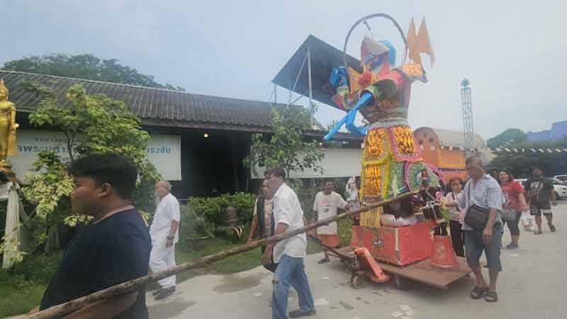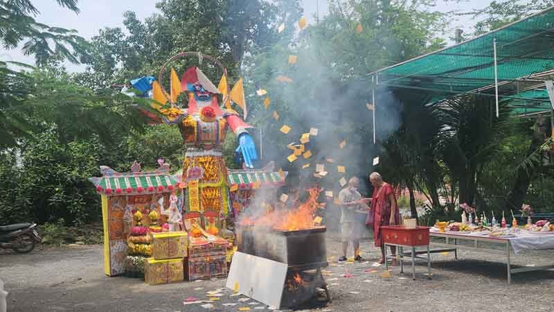 โดยบรรยากาศมีองค์ไต่สือเอี๊ยจำลอง พร้อมมีขบวนเคลื่อนเข้าสู่พิธีเผา ในส่วนของชาวบ้านที่ไม่ได้มาเข้าร่วมพิธี ทางวัดได้ทำเฟซบุ๊กแจ้ง ให้ส่งรายชื่อบรรพบุรุษมาทางระบบออนไลน์ มาที่วัดเพื่อทางวัดได้พิมพ์ชื่อมารวบรวมไว้ใส่ลงไปในโลงศพเพื่อประกอบพิธีให้ ซึ่งมีจำนวนมากกว่า 2-3 พันรายที่ส่งมา นำมารวบรวมใส่ลงในโลง