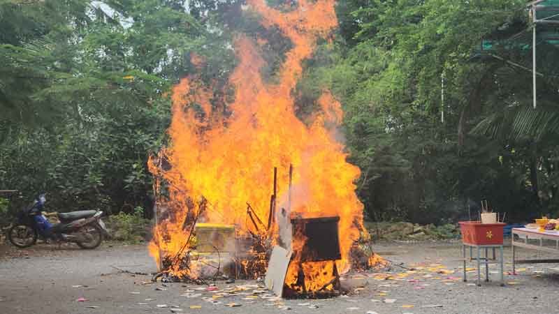 จากนั้นพระสงฆ์ประกอบพิธีสวดทำบุญบังสุกุล พร้อมสวดเจริญพระพุทธมนต์ ให้กับเหล่าดวงวิญญาณที่ล่วงลับ พร้อมกับจัดตั้งอาหารคาวหวานไหว้กลางแจ้ง โดยหลวงพ่อแป๊ะประกอบพิธีด้วยตนเอง ใช้เวลากว่า 2 ชม. หลังจากเสร็จสิ้นพิธีทางพระแล้ว ได้ประกอบพิธีเผาทั้งโลงศพและกระดาษที่อยู่ภายในโลงศพจนมอดไหม้หมดสิ้น และกรวดน้ำอุทิศให้กับผู้ที่ล่วงลับ