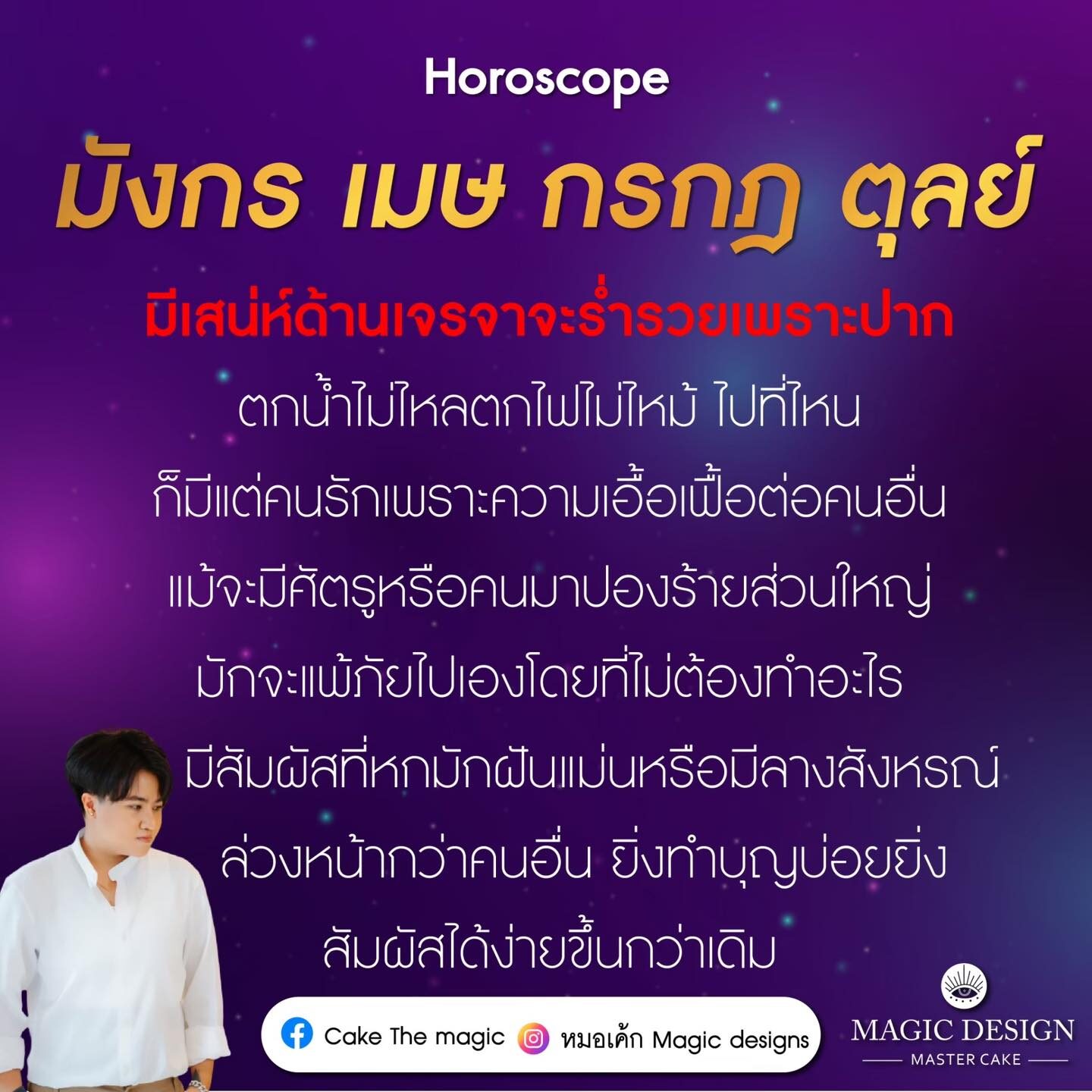 หมอเค้กMagic stone เผยถึงดวงชะตาราศี หลังตุลานี้ไปดวงยิ่งดียิ่งแรง หยิบจับอะไรก็เป็นเงินเป็นทอง จะไปที่ไหนก็มีแต่คนรักคนเมตตา มารที่เข้ามาจะแพ้ภัยไปเอง สิ่งใดที่เกิดขึ้นและจบลง