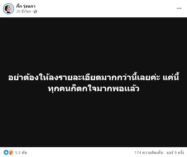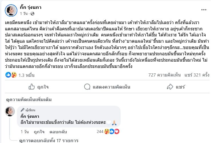 โดย กิ๊ก รุ่งนภา โพสต์ข้อความสุดช้ำหลายโพสต์ล่าสุดว่า “ถูกสวมเขาครั้งแล้วครั้งเล่า ครั้งนี้ก็ซ้ำรอยเดิม เจ็บที่เดิม ในวันนี้ทุกอย่างมันจบลงแล้ว ไม่ถามหาความจริง แต่ความจริงมาหาถึงที่ ต่อจากนี้ฉันจะกอดตัวเองให้แน่นที่สุด”