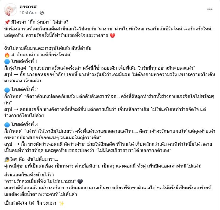 ขณะที่เพจ อรรถรส สรุปเรื่องราวของ กิ๊ก รุ่งนภา และภาพรอยบาดแผล พร้อมทั้งเผยข้อมูลที่ไปตามสืบมาแล้วถึงฝ่ายชายคู่กรณีเป็นทหารและมือที่สามเป็นครูด้วยว่า