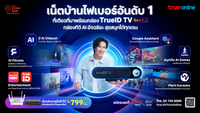 ล้ำสุด คุ้มสุด… ทรูออนไลน์ ยกระดับชีวิตอัจฉริยะในบ้านทุกวันกับเน็ตบ้านไฟเบอร์อันดับ 1 ที่แรก ที่เดียว ที่มาพร้อมนวัตกรรมกล่องทีวี AI อัจฉริยะ TrueID TV Gen3 ที่เปลี่ยนบ้านให้เป็นสมาร์ทโฮม ตอบโจทย์ทุกเจเนอเรชั่นในบ้าน กับฟีเจอร์ AI อัจฉริยะ พร้อม NEW AI CHIPSET ภาพคมชัดระดับ 4K HDR ไหลลื่น ไม่สะดุด สนุกกับ AI Games แค่ขยับก็เล่นได้ ไม่ต้องใช้รีโมท จอยสติ๊ก มี AI Fitness รวมคลาสฟิตเนสกว่า 300 คลาส ใช้ AI นับแคล และให้คะแนนแบบเรียลไทม์ เหมือนมีเทรนเนอร์ส่วนตัว สุขกับการร้องคาราโอเกะแบบ Exclusive เพลงฮิตจากแกรมมี่จากแอปเพลิน และมี Google Assistant สั่งการด้วยเสียงภาษาไทย พร้อมจัดเต็มความบันเทิง คอน เทนท์จากทรูไอดี แบบครบครัน ให้ทั้งบ้านสุขสนุกได้ทุกเจน