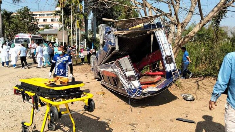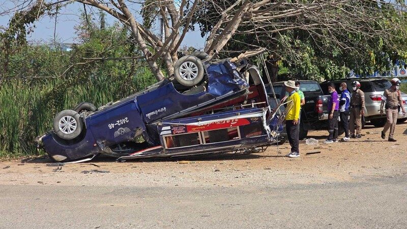 อุบัติเหตุเศร้า รถสองแถวโดยสาร พาคนป่วยมาส่งรพ. กำลังจะเลี้ยวเข้าเจอรถบรรทุกตู้คอนเทนเนอร์เสยท้ายกระเด็น พลิกหงายท้องล้อชี้ฟ้าพังยับ ยาย 77 เสียชีวิต เจ็บอีก 8