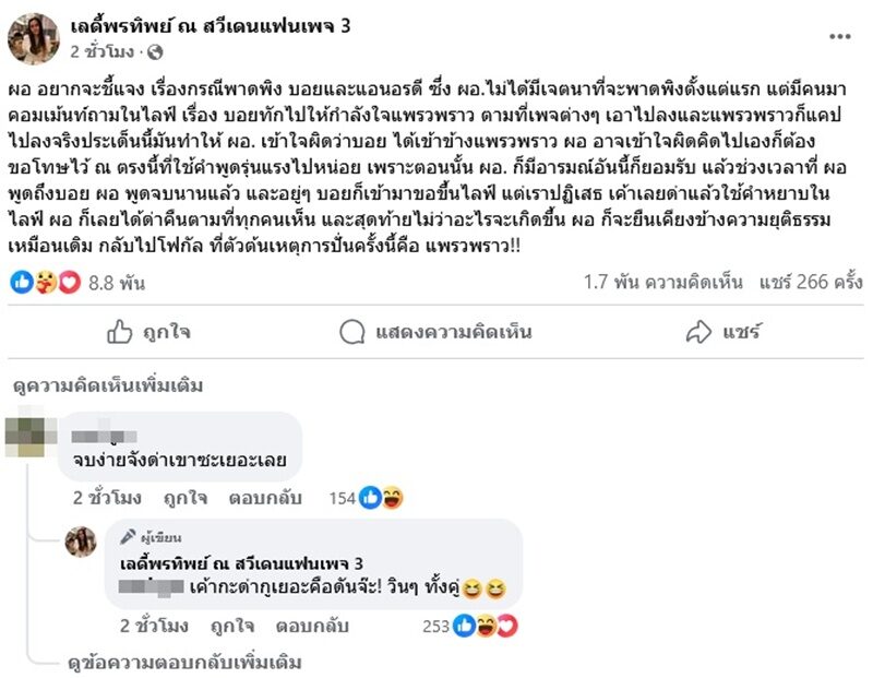 ขณะที่ เฟซบุ๊ก เลดี้ พรทิพย์ ณ สวีเดนแฟนเพจ3 ล่าสุดโพสต์ข้อความกรณี พาดพิง บอย ศิริชัย ด้วยว่า “ผอ. อยากจะชี้แจง เรื่องกรณีพาดพิง บอยและแอนอรดี ซึ่ง ผอ.ไม่ได้มีเจตนาที่จะพาดพิงตั้งแต่แรก แต่มีคนมาคอมเม้นท์ถามในไลฟ์ เรื่อง บอยทักไปให้กำลังใจแพรวพราว ตามที่เพจต่างๆ เอาไปลงและแพรวพราวก็แคปไปลงจริงประเด็นนี้มันทำให้ ผอ. เข้าใจผิดว่าบอย ได้เข้าข้างแพรวพราว”