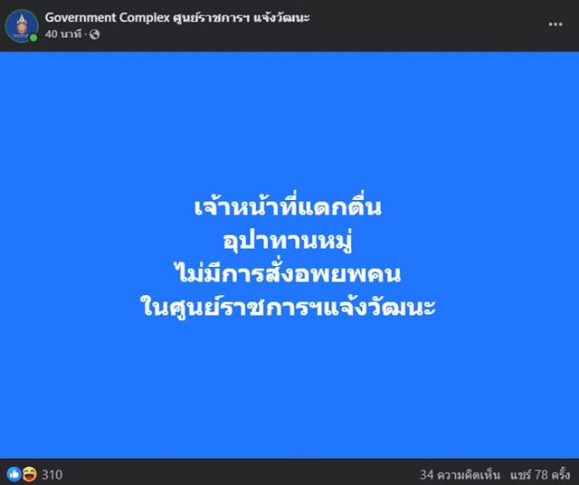 วันที่ 2 เม.ย.2568 แฟนเพจเฟซบุ๊กชื่อ "Government Complex ศูนย์ราชการฯ แจ้งวัฒนะ" ซึ่งเป็นเฟซบุ๊กของศูนย์ราชการฯ ได้โพสต์ข้อความระบุว่า "เจ้าหน้าที่แตกตื่น อุปาทานหมู่ ไม่มีการสั่งอพยพคน ในศูนย์ราชการฯแจ้งวัฒนะ"