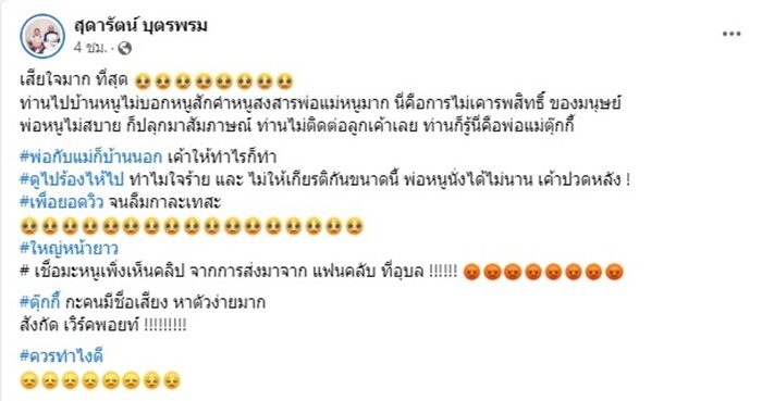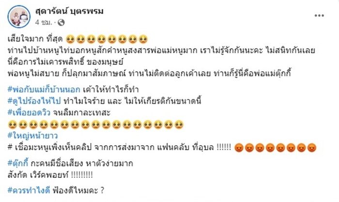 เป็นใครก็เดือด นักแสดงสายฮา ตุ๊กกี้ สุดารัตน์ บุตรพรม โพสต์ข้อความฟาดแรงโดยแคปหน้าช่องยูทูบที่มีหน้าพ่อแม่ครอบครัวที่บ้านของเจ้าตัวที่ระบุข้อความเยี่ยมบ้านเกิดตุ๊กกี้ พร้อมของขึ้นร่ายยาวว่า