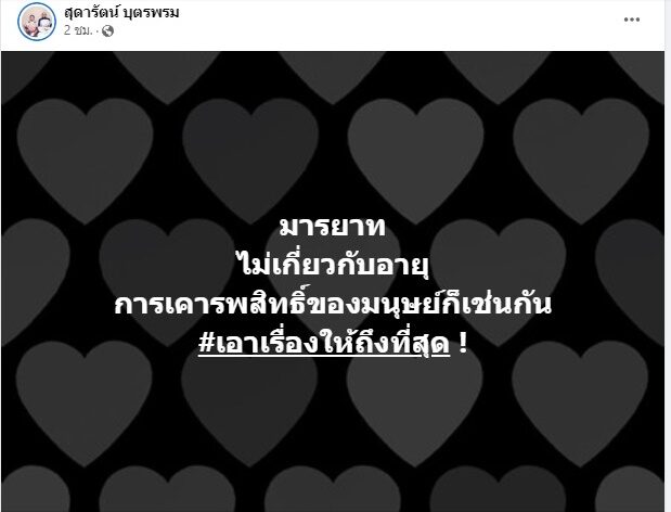 ก่อนจะโพสต์อีกว่า “มารยาทไม่เกี่ยวกับอายุ การเคารพสิทธิ์ของมนุษย์ก็เช่นกัน #เอาเรื่องให้ถึงที่สุด!” , “เจตนาจะดีไม่ดีไม่เกี่ยว มันอยู่ตรงที่ว่า ลูกหลานเค้าทำไมคุณไม่บอกไม่แจ้งเค้า ต้องรอ เค้าอนุญาต ไหม ! ก่อนที่จะถ่ายทำออกสื่อขนาดนี้ แล้วถ้าเค้าอยากเปิดบ้าน เค้าให้ลูกเค้าถ่าย ให้รายการใหญ่ๆ มาถ่าย ไม่ดีกว่าเหรอ ? คุณมาเปิดเผย โดย พลการ มารยาท/ กาละเทสะ ( ล่วงคัก)