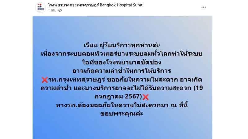 เช่นเดียวกับ โรงพยาบาลกรุงเทพสุราษฎร์ Bangkok Hospital Surat โพสต์แจ้งประชาชนที่เข้ามาใช้บริการ โดยระบุว่า เนื่องจากระบบคอมพิวเตอร์บางระบบล่มทั่วโลกทำให้ระบบไอทีของโรงพยาบาลขัดข้อง อาจเกิดความล่าช้าในการให้บริการ